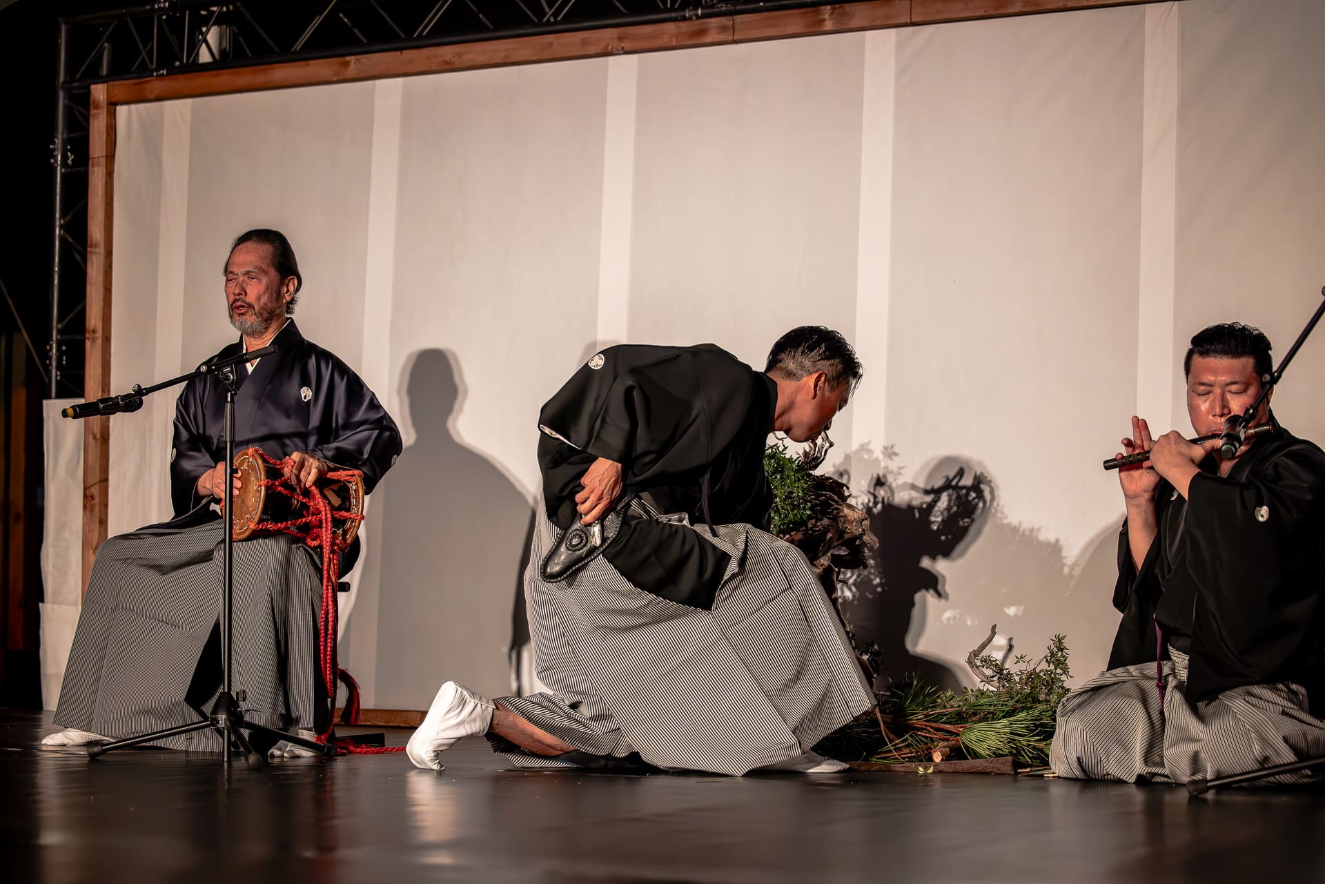 For this performance, Yugao was specially revived, and I arranged flowers improvisationally on the kagami-ita (back panel of the Noh stage) using a real pine tree, making it a unique production just for this evening.